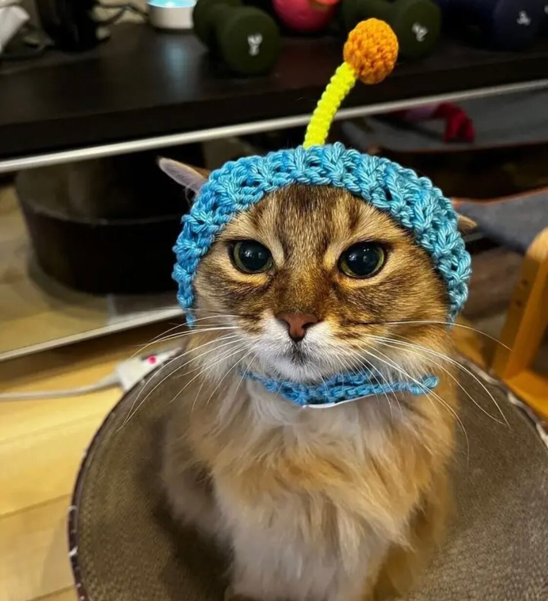 頭の真ん中から丸いアンテナがにょきっと生えた、宇宙人風の猫用帽子です。