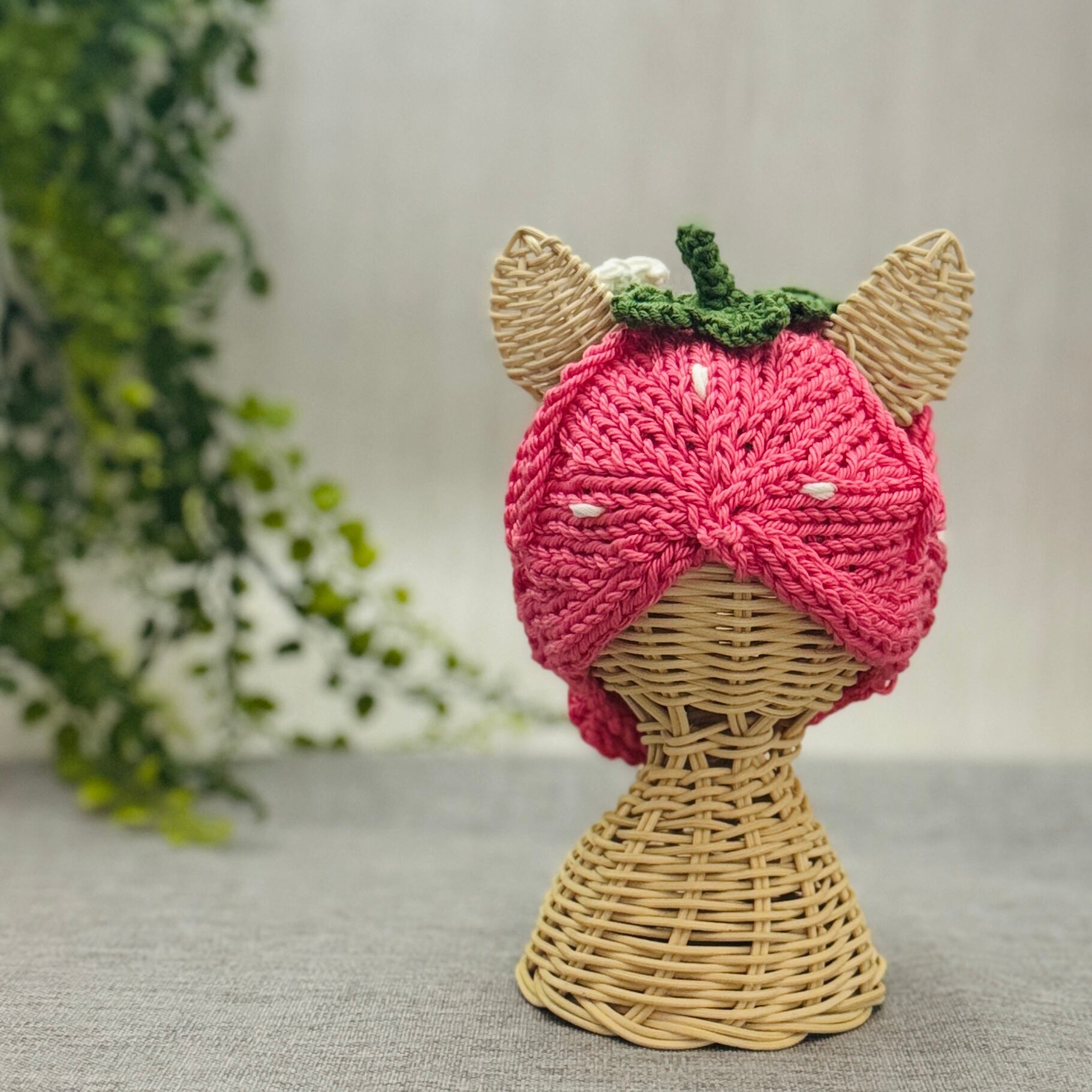 鮮やかなビビッドピンクのいちごをモチーフにした、ポップで可愛い猫ちゃん用ニット帽。