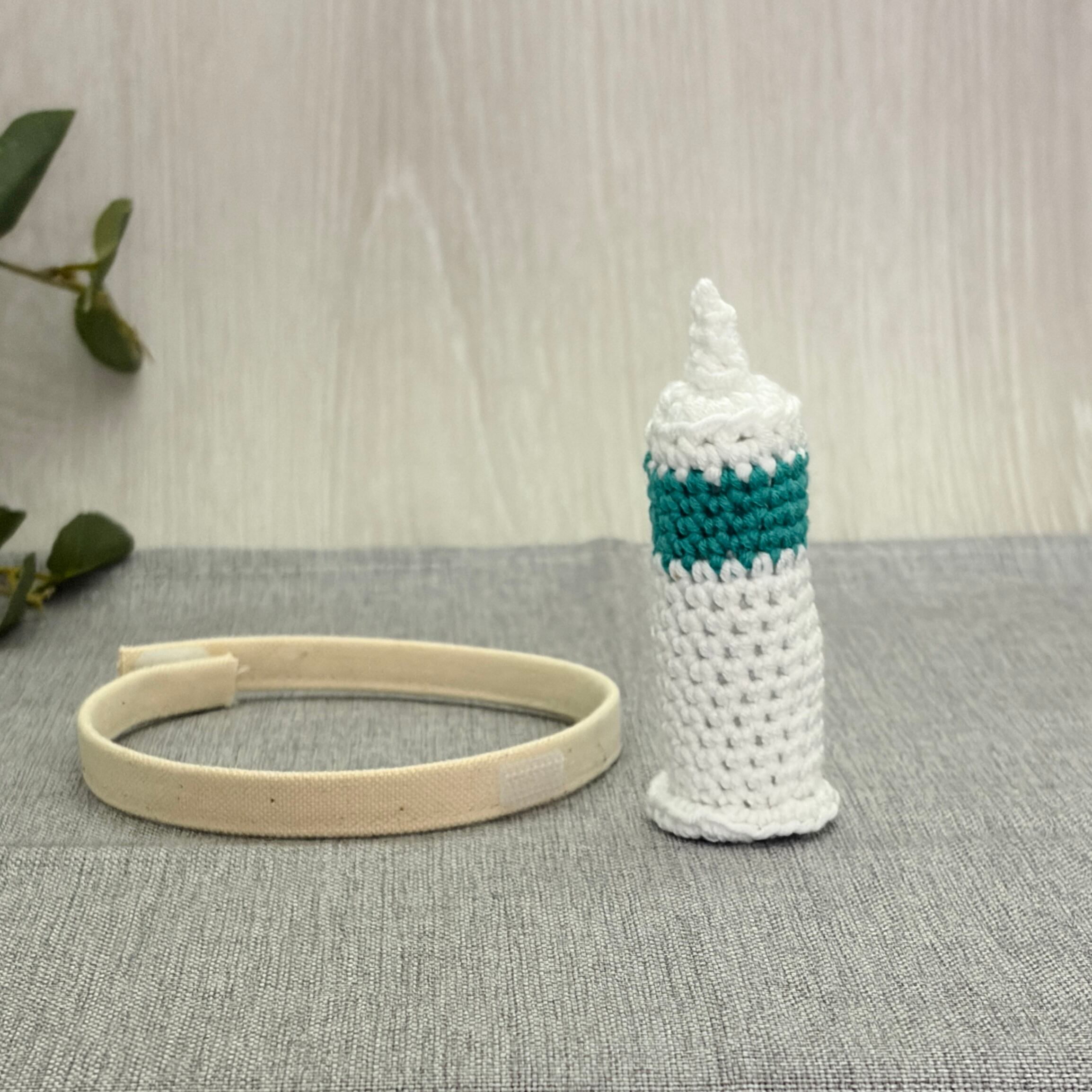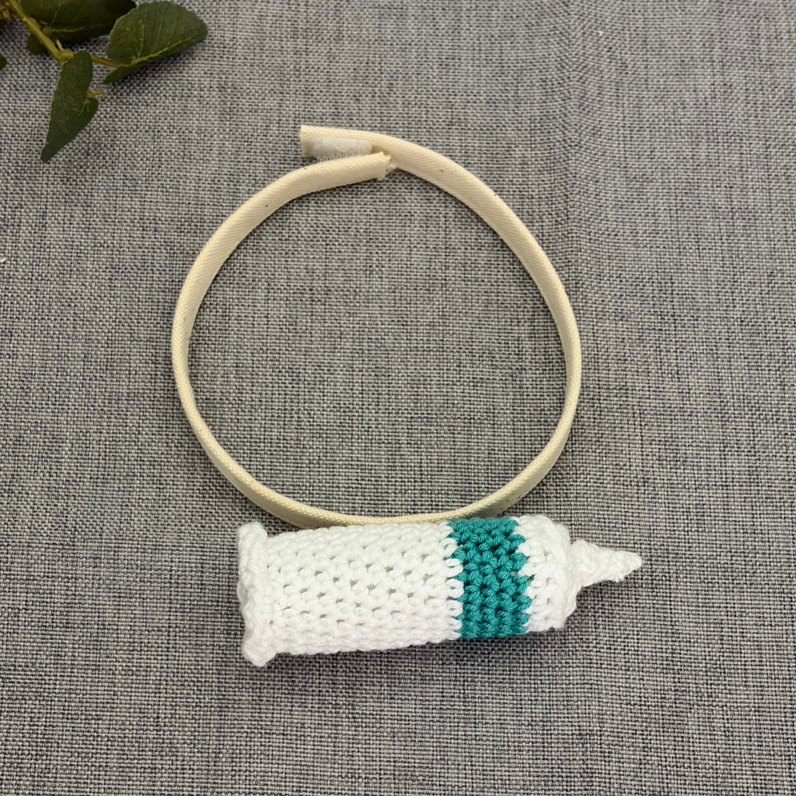 ナースキャップがちょこんと乗った帽子と、首から下げられる注射器モチーフがセットになった猫用帽子です。